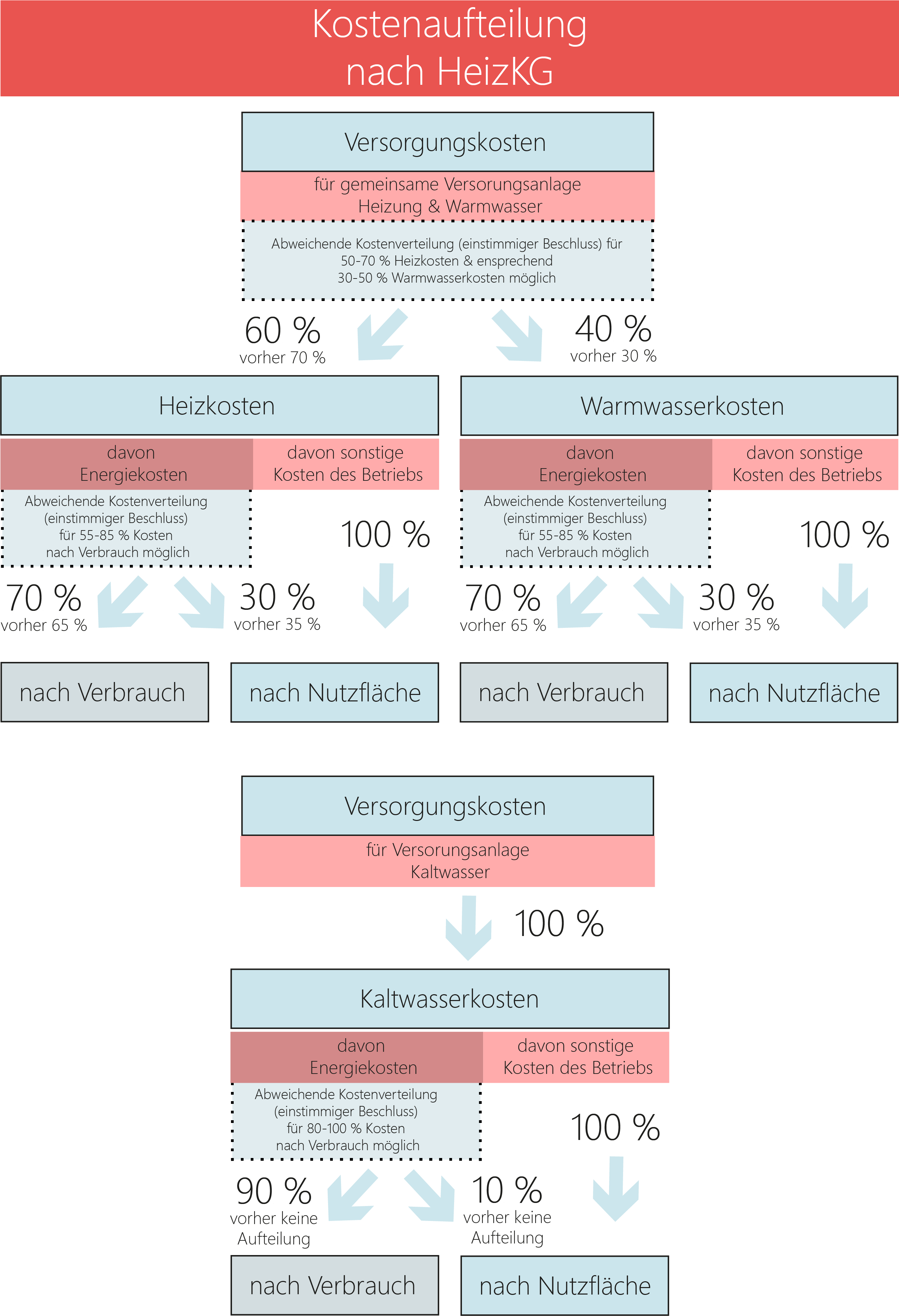 - Für Versorgungskosten ist eine abweichende Kostenverteilung für 50-70 % Heizkosten und entsprechend 30-50% Warmwasserkosten möglich