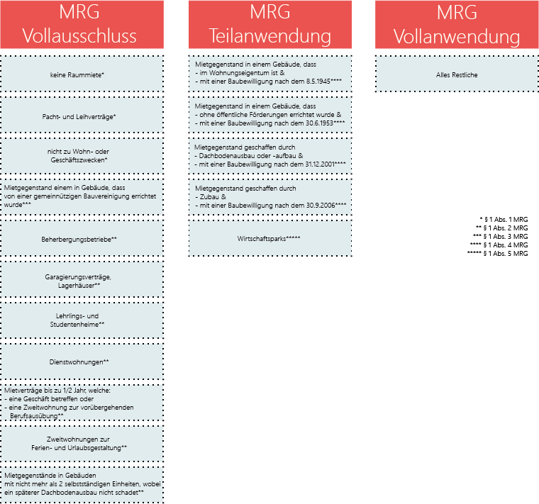 Unterschieden wird hier zwischen dem Vollanwendungsbereich (es gelten bei einer Vermietung alle Paragrafen des MRG), dem Teilanwendungsbereich (es gelten nur Teile des MRG, darunter die besonders wichtigen Kündigungsbestimmungen lt. MRG) und Vollausschluss (das MRG findet keine Anwendung). Kommt das Mietrechtsgesetz nicht oder nur teilweise zur Anwendung gelten grundsätzlich aber trotzdem immer die Regeln des allgemeinen bürgerlichen Gesetzbuches (ABGB), welche auch Regeln für die Vermietung vorsehen, in Summe aber mehr Vertragsfreiheit lassen als das Mietrechtsgesetz.