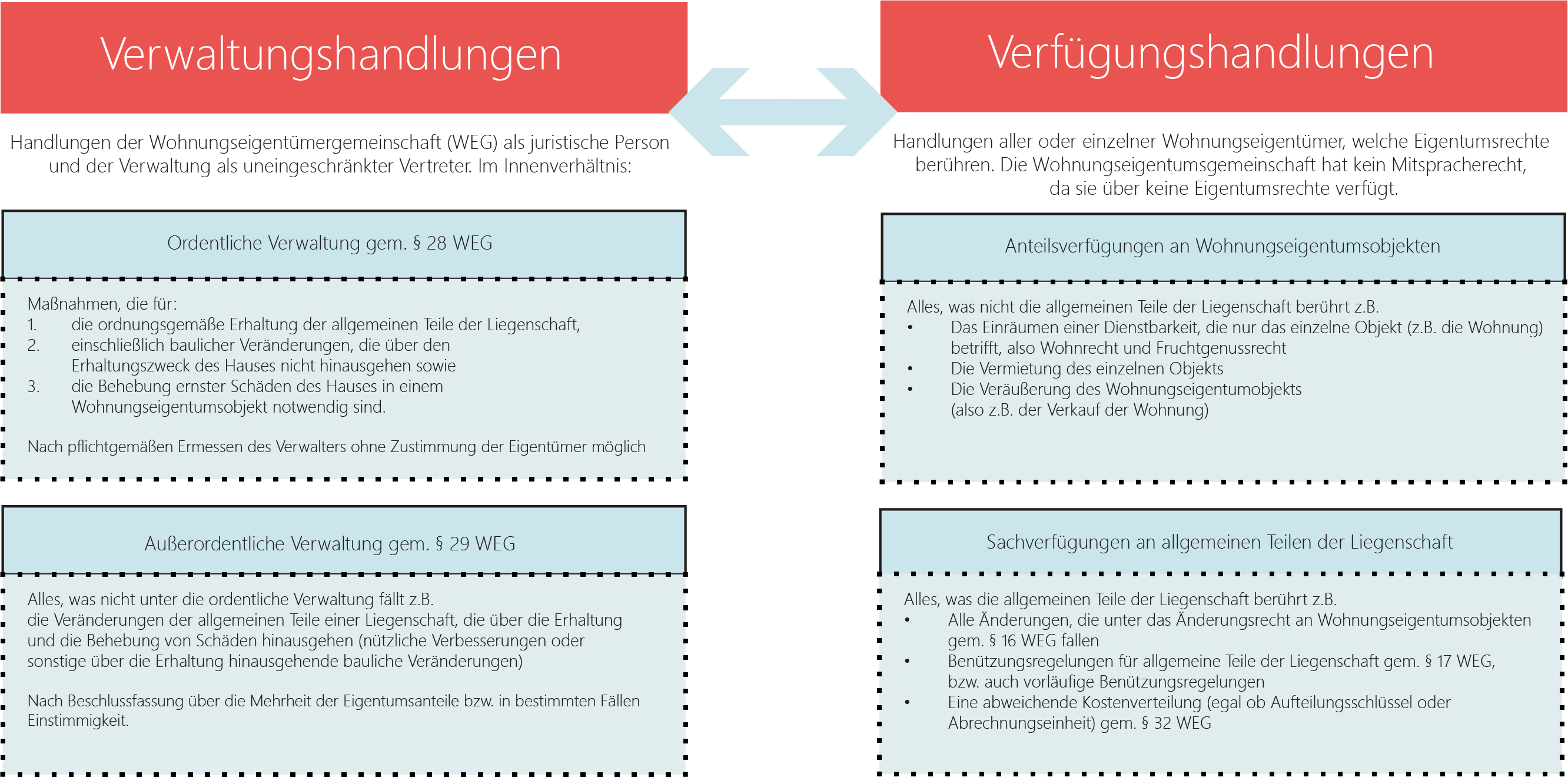 Diese Maßnahmen sind in § 28 WEG verankert. Die drei genannten Kriterien sind dabei bei der Einordnung essentiell. Zusätzlich bietet das Gesetz auch eine Aufzählung an, welche Maßnahmen eindeutig der ordentlichen Verwaltung zuzuordnen sind. Hierbei ist wichtig, dass dies jedoch keine vollständige Aufzählung der Maßnahmen ist. Das heißt, sollten noch weitere Maßnahmen der ordentlichen Verwaltung hinzugezählt werden, sind die drei oberen Kriterien ausschlaggebend. Was genau man unter dem Begriff Erhaltung versteht, wird in einem separaten Artikel besprochen, wichtig ist jedoch, dass es sich hier um die dynamische Erhaltung handelt. Darunter versteht man, dass Maßnahmen sehr wohl noch zur Erhaltung hinzugezählt werden, wenn sie den zeitlichen und örtlichen Gegebenheiten entsprechen, es muss also kurzum bei der Einordnung als „Erhaltungsmaßnahme“ auch auf die Entwicklung der Bautechnik und die zeitgemäße Wohnkultur Rücksicht genommen werden.